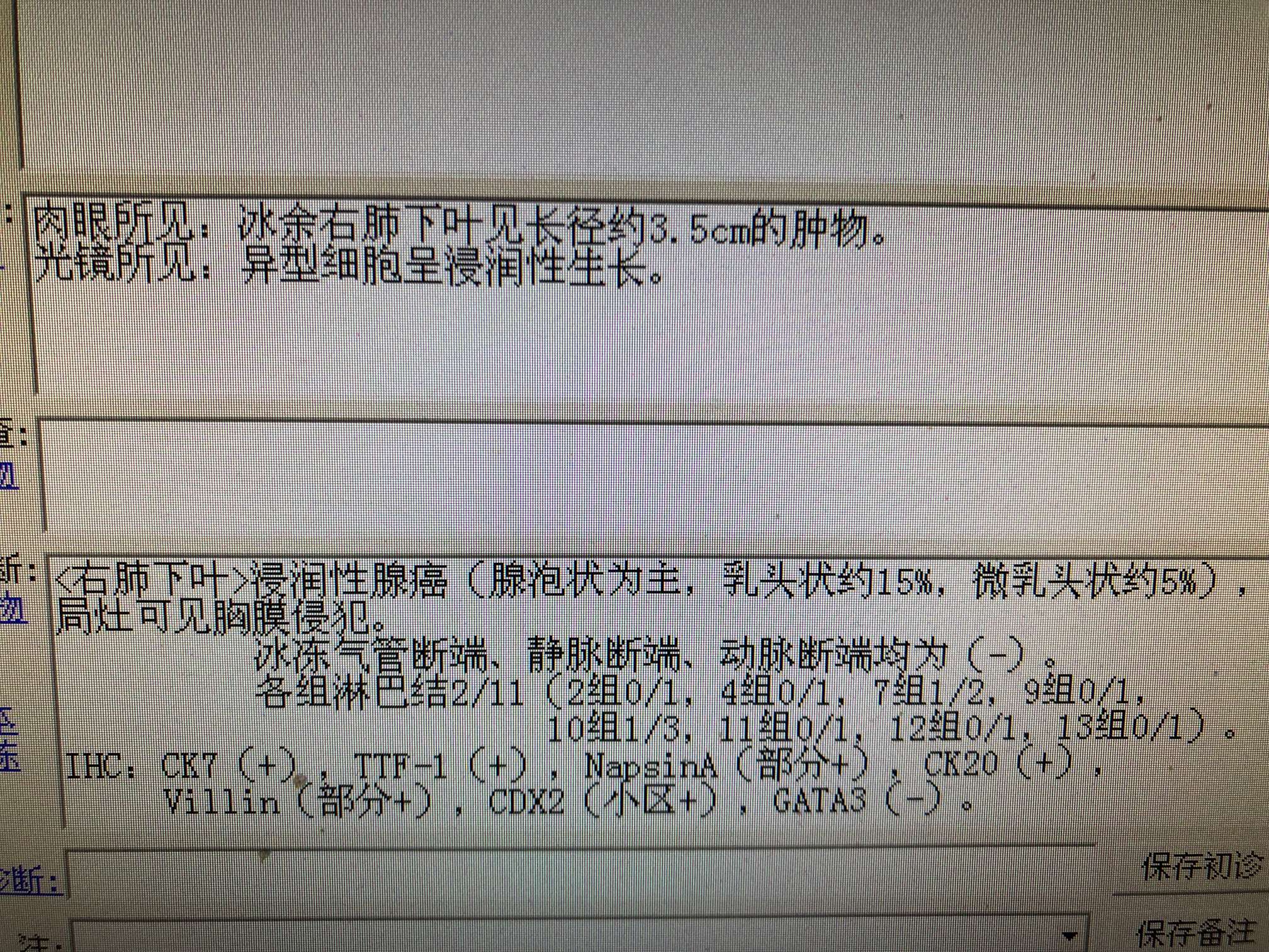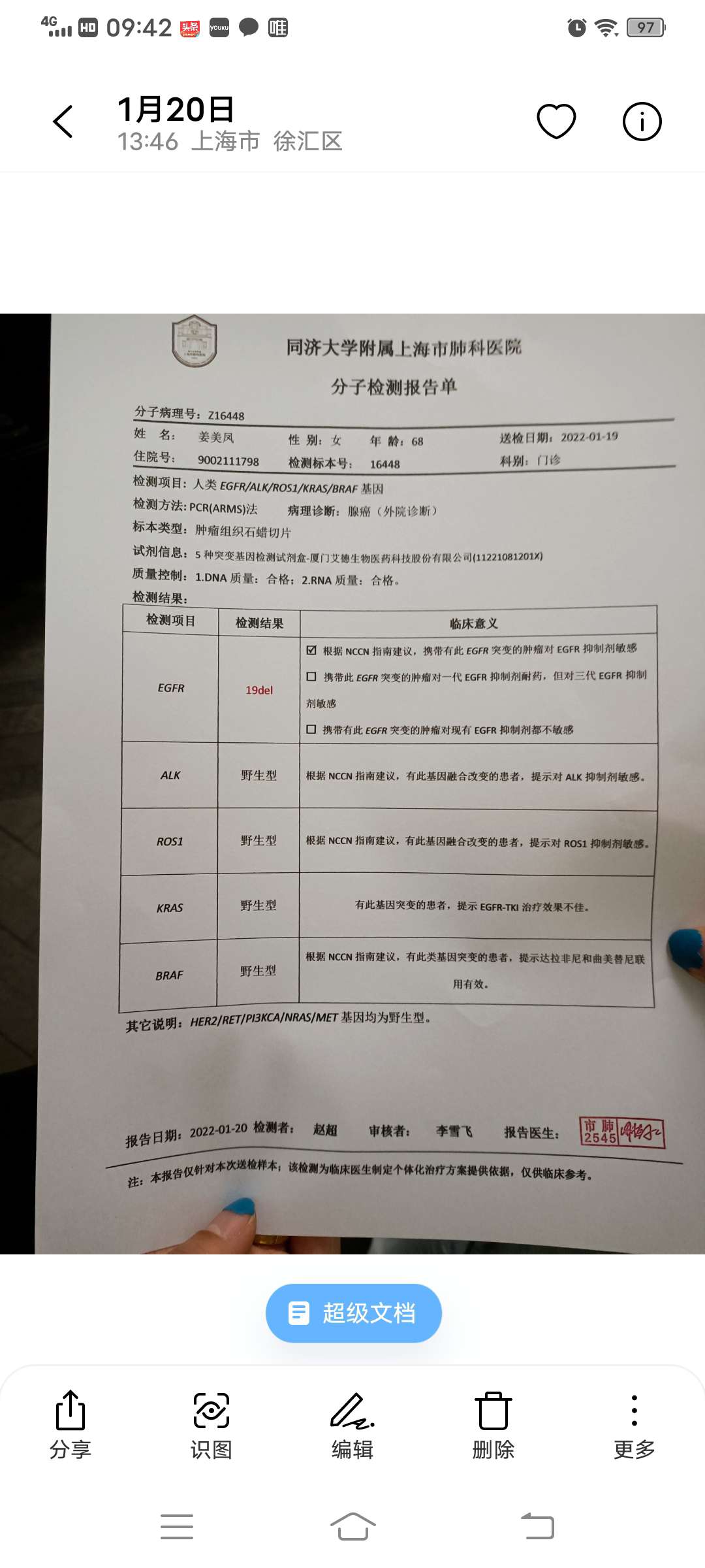 术后病理报告单发去看看。这是基因检测报告单,EGFR19点位缺失,术后辅助治疗可以用靶向药,三代奥希替尼数据不错