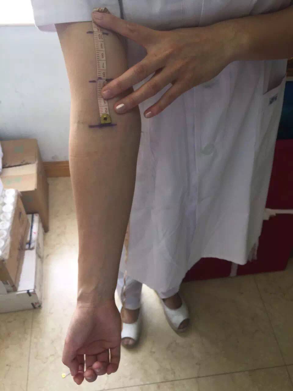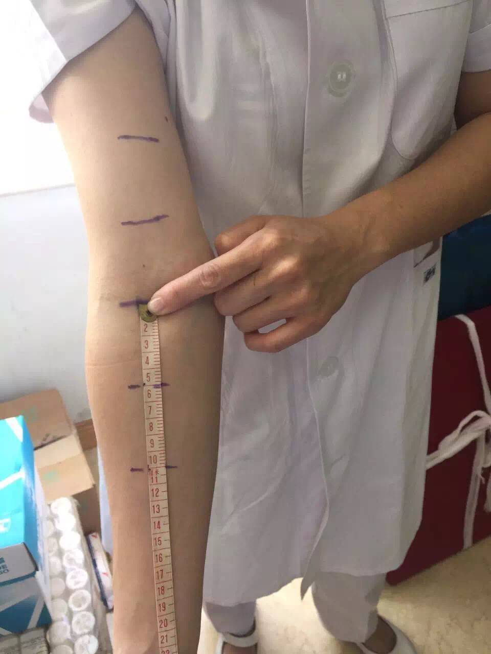 弯曲上臂,在双上肢肘窝中心处各画一横线,以此线为中点向上臂及前臂5cm处及10cm处各各画一横线,以此4条线(肘上5cm、肘上10cm、肘下5cm、肘下10cm)作为测量臂围的固定位置。然后比较双上肢臂围差。