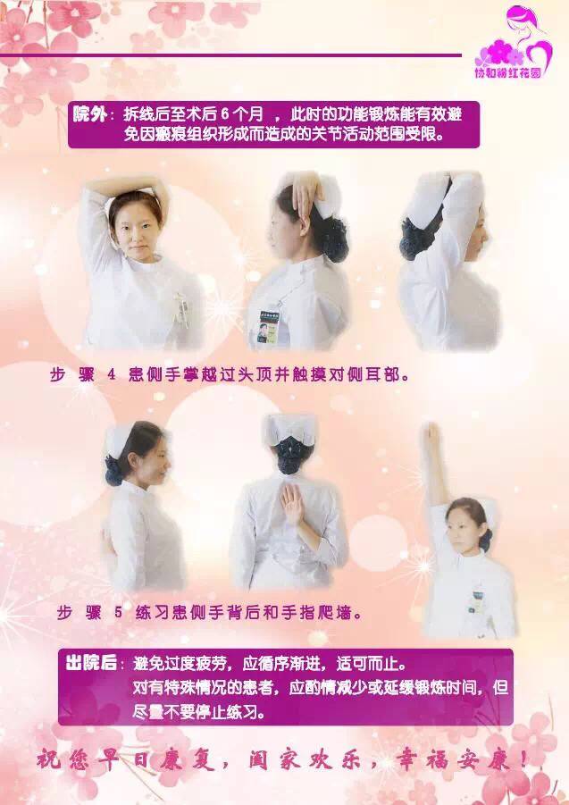 术后24小时伸指握拳动作;术后1-3天主要锻炼手、腕部及肘关节的功能;术后2-3天练习屈肘、屈腕、前臂伸屈运动;术后4-7天摸同侧耳廓、对侧肩;术后9-10天抬高患侧上肢;术后14天低头位,患侧手放于颈后,挺胸、抬头,患侧手掌越过头顶并触摸对侧耳部,也可做扶墙练习。