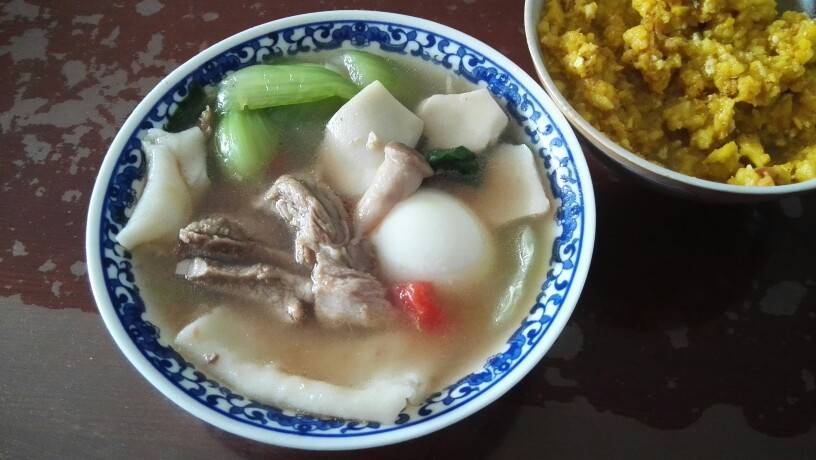 旁边还有这碗我妈做的排骨面片汤……还是先吃面吧