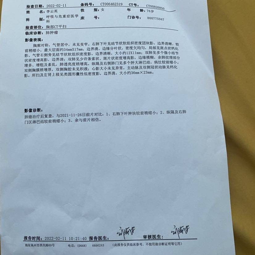 妈妈患肺癌已经有三年了,这三年来一直在接受治疗到现在,下面是妈妈检查以及治疗的过程。2010年10月,妈妈体检出肺癌IV期,纵隔淋巴转移,肝部转移,去省肿瘤医院复查,做了PET-CT,结果一样,省肿瘤