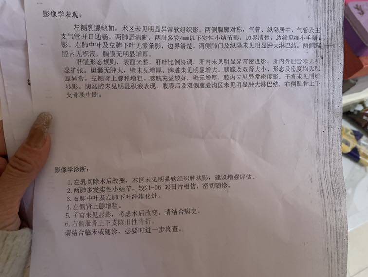 由于老妈12月份骑车摔跤了,把耻骨摔骨折了,就一直拖到现在才去检查、每次检查都是提心吊胆😌真的害怕又出新情况,上次是去年6月30号检查的,基本与之前都相仿!肺部小结节一直没有变化,脑部一直都考虑缺血灶,复发之后一直吃来曲唑一年零四个月了,说明对内分泌的治疗效果还是非常好的,下次检查半年后,大家一起加油!