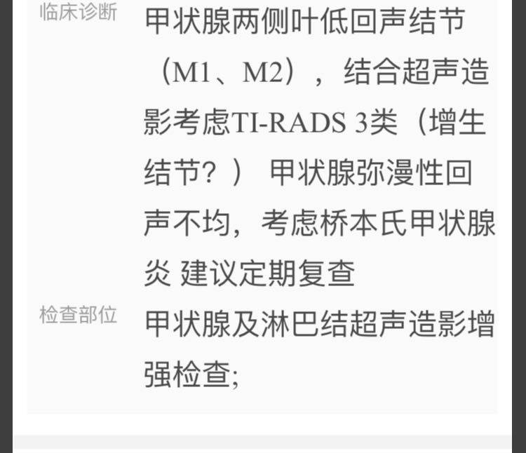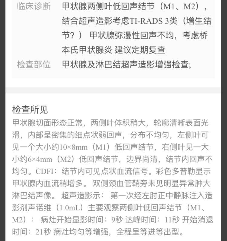 今天排了一个小雷,挂了手术医生的号,做了一个甲状腺超声的造影检查,结论:增生结节,报3级。