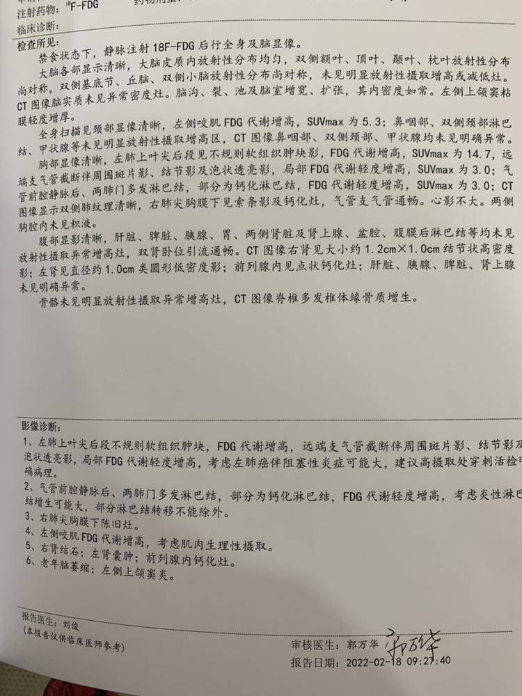 过年大年初一发烧,一直反反复复的,初五去了医院急诊挂了三天水,自我感觉良好。本来准备问医生是不是能停药了。结果就被收住院。各种检查,穿刺。最后今天拍了petct。报告我是看了,但还是有点不敢相信。谁能帮我解读一下,爸爸是早期还是晚期了
