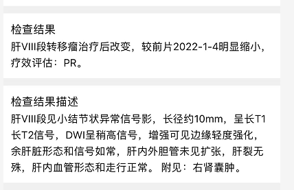 3、即将开始第三疗程前进行了复查,发现肝部转移的病灶实现了PR,体积缩小了60%,这是一个好消息,纵膈淋巴结较之前略有减少,肿瘤指标也基本正常,总体趋势还是不错。