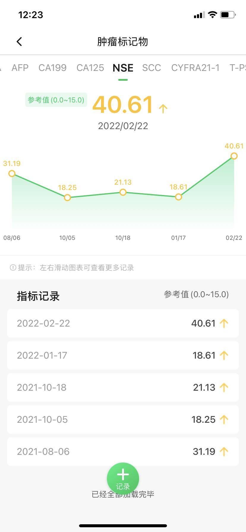 妈妈肺腺癌多处骨转,19突变,一线奥希六个月,今天查血除了白细胞偏低,糖类抗原NSE升高,其他都正常。妈妈从确诊时CEA就不高,只是ca199和NSE高出正常值不少,吃奥希两个月后复查所有肿标恢复正常,影像大面积缩小,五个月复查时影像继续缩小,骨转部分恢复,肿标也一直正常。今天住院输骨转针,顺便让医生查了肿标,发现这月NSE升高,浅意识感觉肿标升高是哪里出了问题。分析从开始CEA不高说明我们CEA不敏感,用药后ca199和NSE恢复正常,说明我们敏感指标是ca199和NSE。经过咨询决定继续观察一阵,加大复查密度,看NSE变化趋势结合影像再做下一步打算,希望下次复查NSE降下来,这样奥希就可以继续吃下去了,再次感谢帮助我的觅健好友。