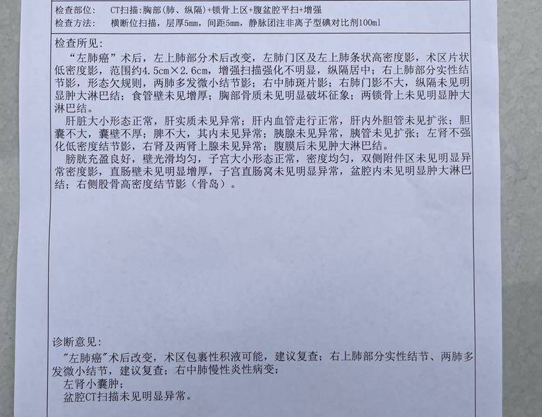1月13日,CT结果显示双肺结节,左肺有2.0*1.5cm结节,胸外科医生会诊建议切除。