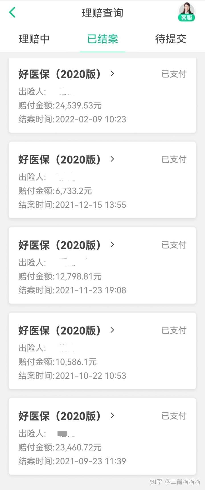 理赔非常方便快捷~通常提交理赔资料邮寄的发票签收后,3~5天钱就到账了!我爸妈一年的保费每人只有1200多,爸爸的治疗费用目前已经理赔了七八万了~现在家里比较大的开销反而是爸爸的营养和各种补充剂的费用而不是医疗费用。