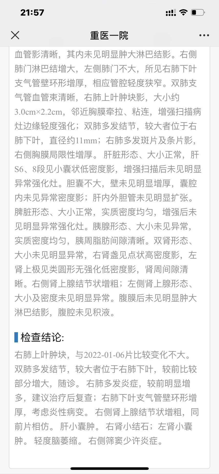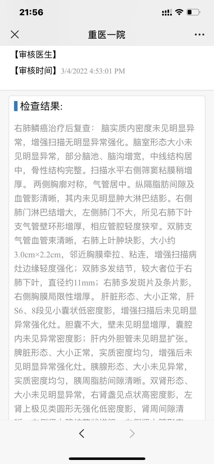 9、22年3月24第14次k药暂停,先治疗放肺,做了普通CT(附图4),请问肺部新增病灶严重吗?之前化疗后右下的小结节已经没有了,现在又出来了我妈这种情况激素还能继续用吗?有没有什么缓解的办法,我也问了陈波医生,拜托哪位大神如果有经验的能帮我看看,感谢
