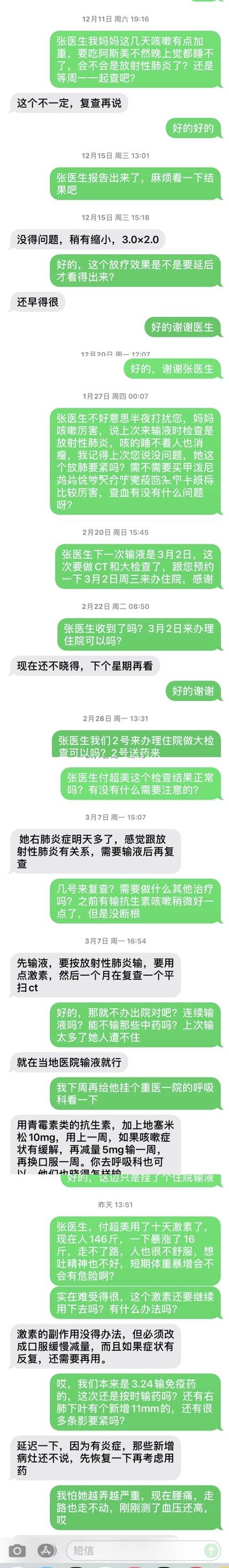 8、22年3月3日第13次单k后(附图3)医生怀疑放肺,用激素输液10天后人暴胖14斤,腰痛,血压高(病人本来就有高血压)走路无力手抖,人没精神难受,还想呕吐。