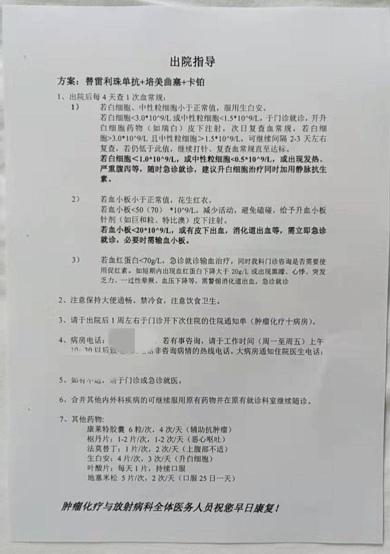 肺腺癌第一次化疗医生给的意见,定期复查血常规,检测一些注意事项,家里离医院挺远的,需要来回奔波……病人难家属也难,看着这些可能发生的副作用和注意事项,身心疲惫