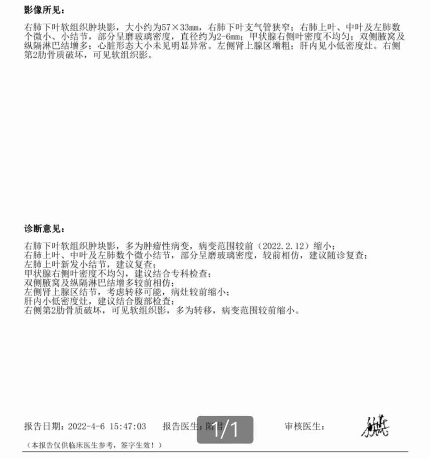 我妈2月初确诊肺癌晚期脑转移骨转移肾上腺转移,分期T4N0M1,在武汉同济做了一个疗程化疗,医生建议做了基因检测,当时体感很不好,人不能自理并且说话有语言障碍,主治医生告诉我这种情况是不可逆的,还要担心脑疝的发生,建议不出院接着做放疗,后来我在网上查了很多资料并和别的城市的医生朋友交流以后决定在等结果的同时盲吃奥希替尼,也加入了觅健的肺癌脑转移群,跟群里的病友和家属们交流,出院第二天在网上买了奥希,开始盲吃,一天以后发现精神有所好转,一周后能下地走路,跟群友们说的一样,3月1号基因检测结果出来,L858R突变,丰度61.08%,证实能吃奥希,三天后开始下楼走路,变化更加明显了,从确诊开始,我妈食欲一直很好,没有对她隐瞒任何病情,她自己调整了两天以后心态也变得很好,目前吃了40多天奥希,基本恢复正常,全身无任何疼痛,也没有脑转的相应症状,唯一的副作用可能是手脚有些脱皮,这两天去复查,癌胚抗原从之前99.99下降到15.42,CT影像显示肿瘤都有所缩小,肺部原发灶缩小一半以上,今天下午做的脑增强核磁共振结果还没出,希望下周能看到一样的好结果,在这里感谢群里朋友的建议和鼓励,希望大家都越来越好!