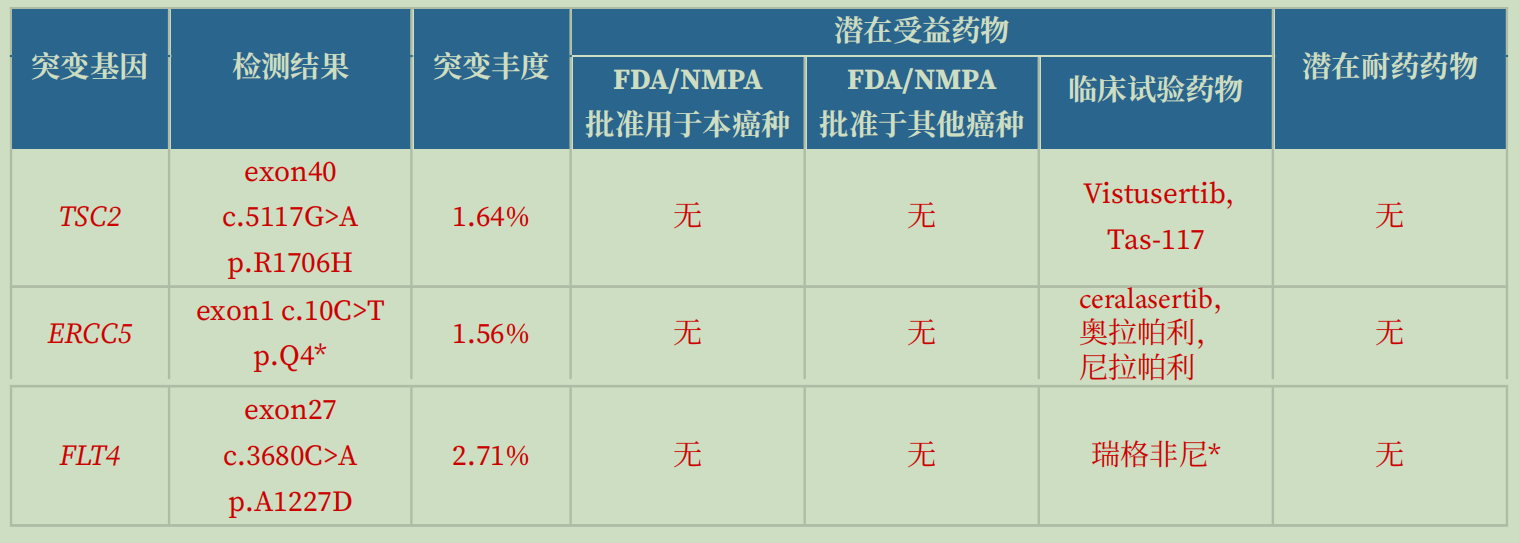 现在发现TSC2、ERCC5、FLT4变异,但没有正式批准的药物,只有临床试验药物