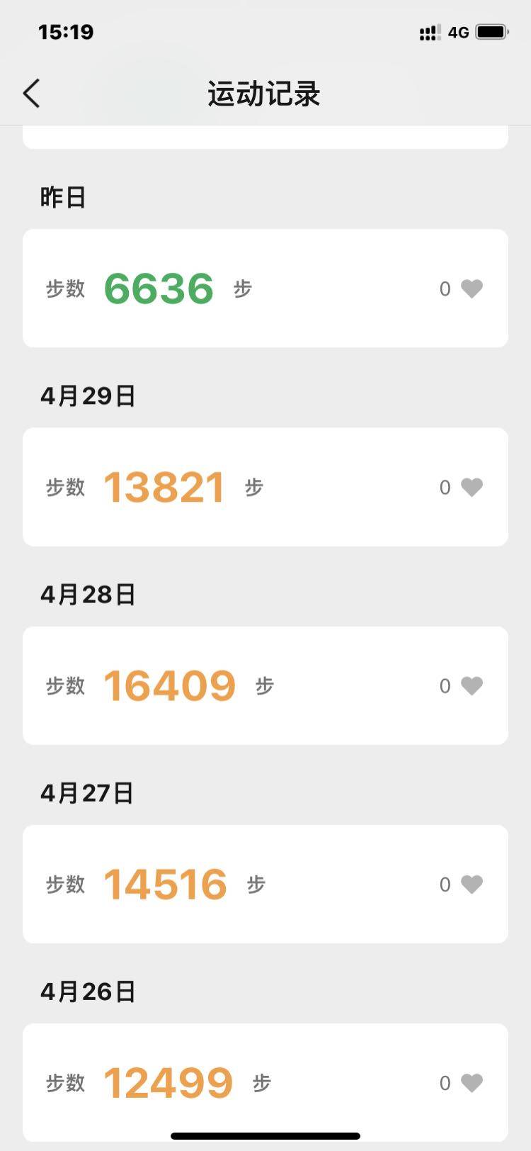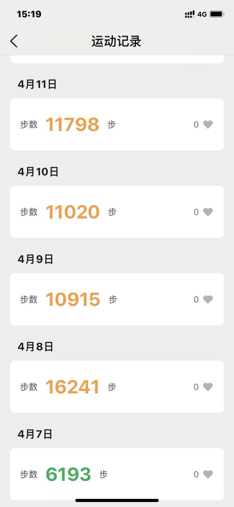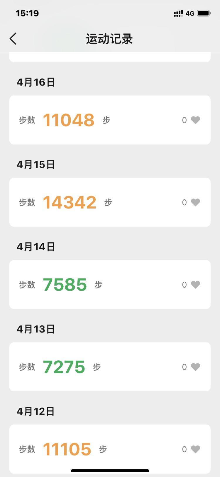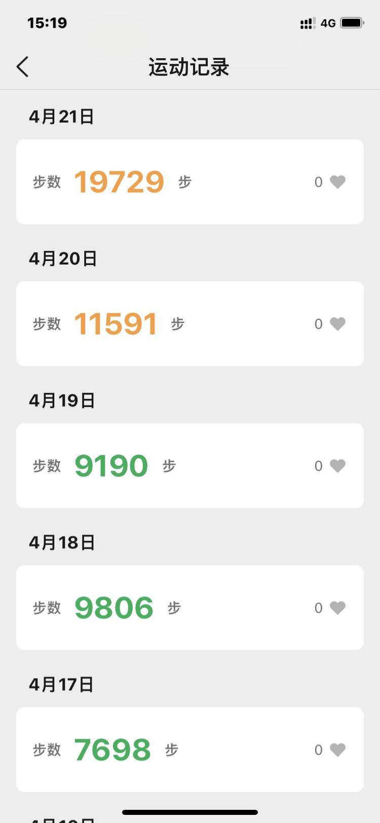 一万步以上19次,5000至10,000步10次