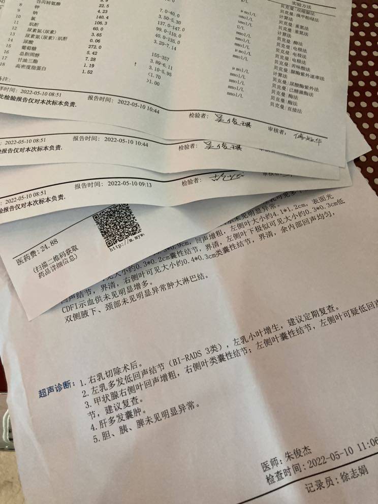 本该是上个月复查的,因为疫情推迟了一个月。做B超的时候两医生边做边说,这里有囊肿那里有结节,右边一个左边上一个下面也有,特别是甲状腺,还问甲状腺是不是手术过?听的我胆战心惊,最后的一句跟上次差不多,定期复查就可以,悬着的心终于放下了,到下个月我就确诊5年了,总算闯过了三阴五年这个关✌️✌️✌️