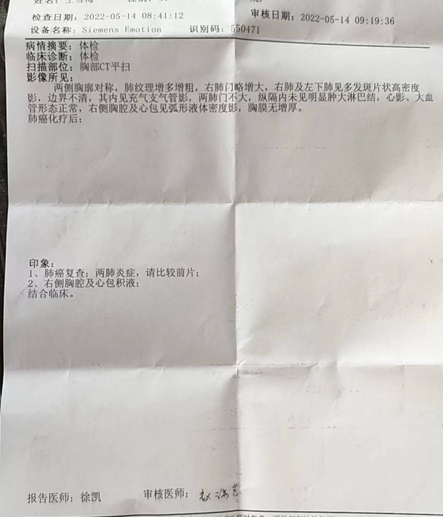 今天麻麻去医院做的复查,血常规各种异常,肿瘤标志物趋势较为平稳。ct 显示有心包积液加炎症,才发现自己罪该万死,从5月6号就应该强制让她去做复查,整整耽误了8天时间。我还总以为是血小板高,麻麻怕的慌才睡不着觉,原来是有积液才睡不着。我错了,错的好离谱。