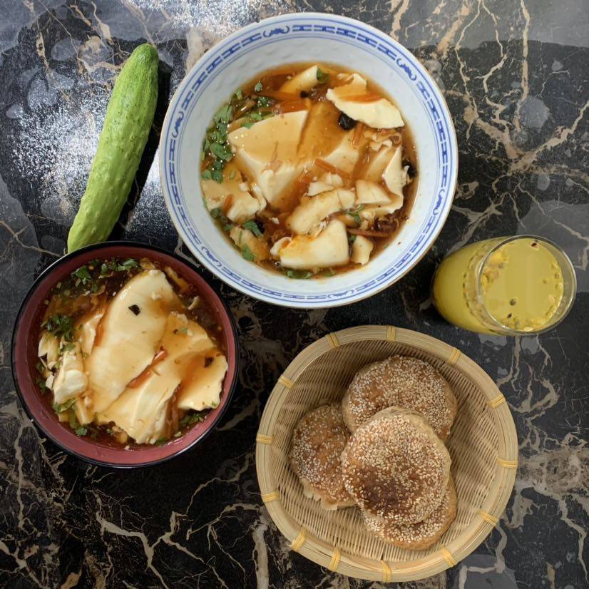 早餐🥣豆腐脑和麻酱饼,都是外面买的。搭配一根黄瓜和一杯百香果水
