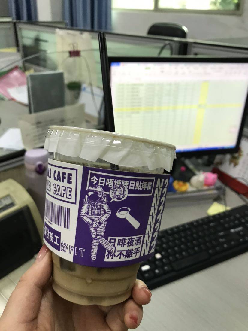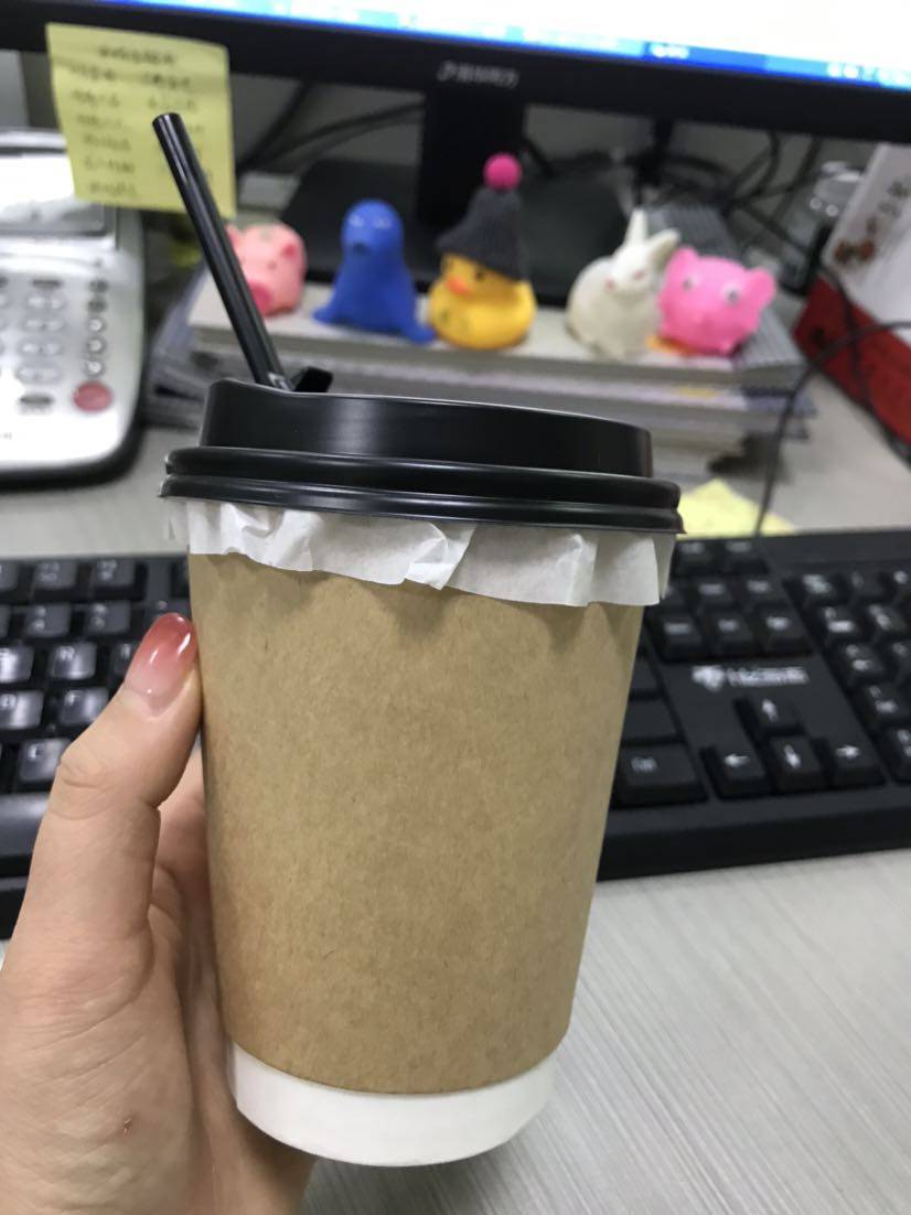 后面这杯是我的热的,刚开始的时候我说包装好丑啊,一下子快乐没了,本来应该喝冰的才有快乐,哈哈。看着看着,嗯,还不错,还挺好看的。😂