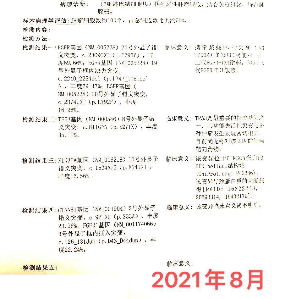 2016年11月份实施手术,大小1.6*1.5*1.3cm,右肺上叶切除,癌淋巴结3组转移,确诊IIIa期肺腺癌,19 EGFR缺失突变,ALK阴性。手术后实施四次化疗(培美曲塞0.97g 卡铂450mg),每月1次。