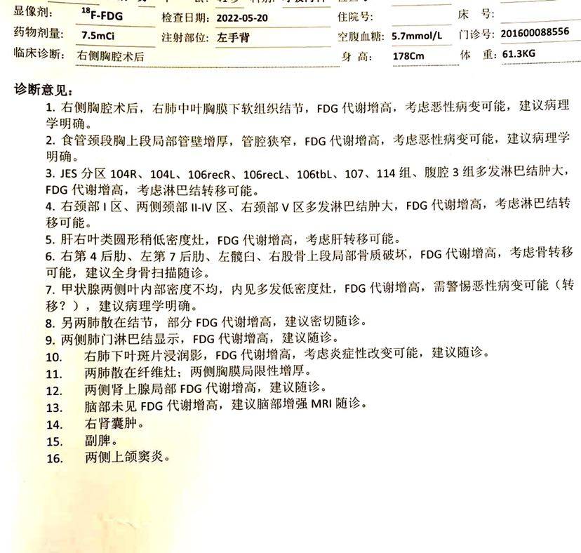 2021年5月,PeT-CT检查。显示肺部稳定,颈部淋巴结压迫越来越严重,骨头有转移。期间咨询过放疗医生,医生说意义不大,不建议放疗。