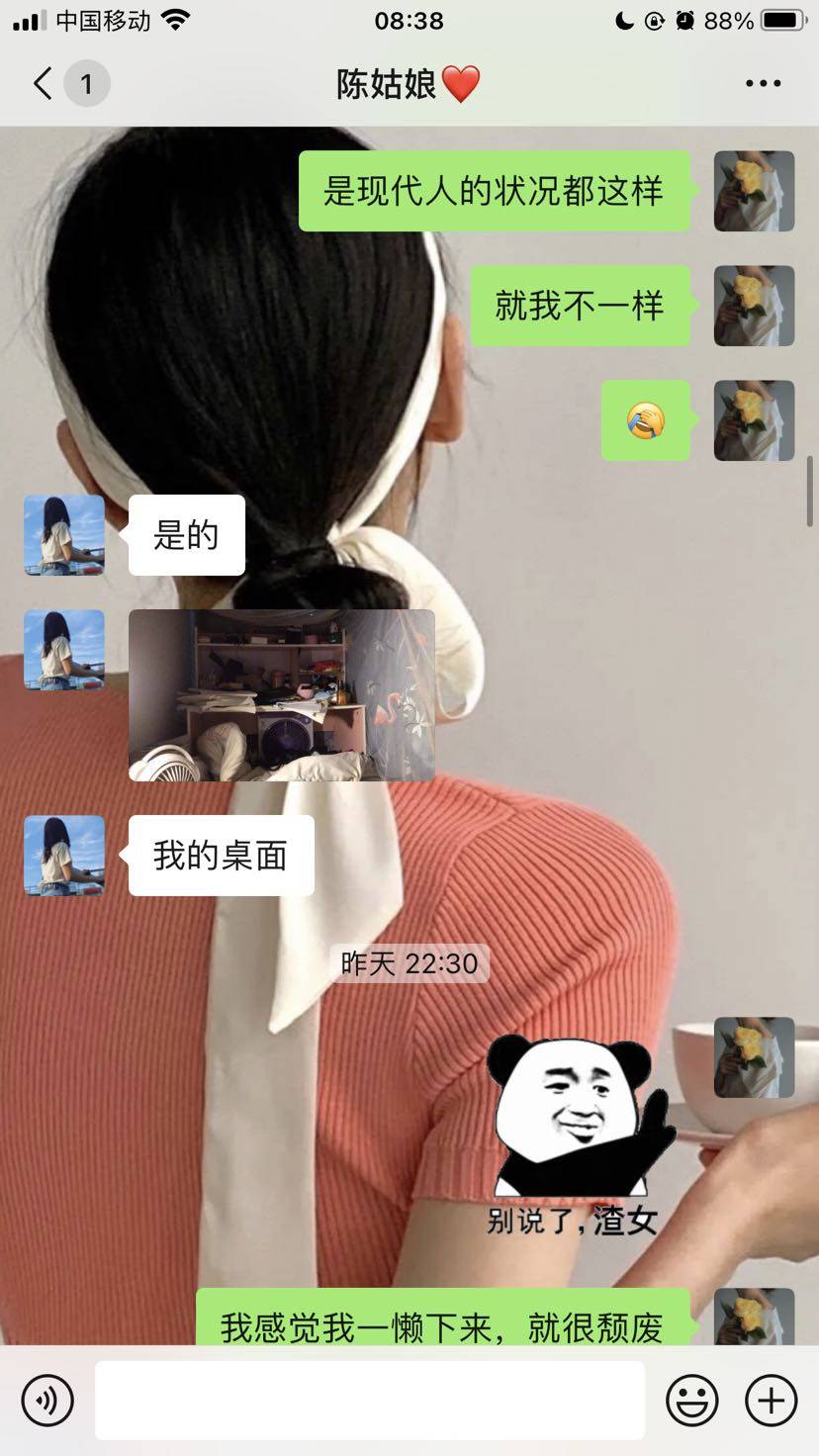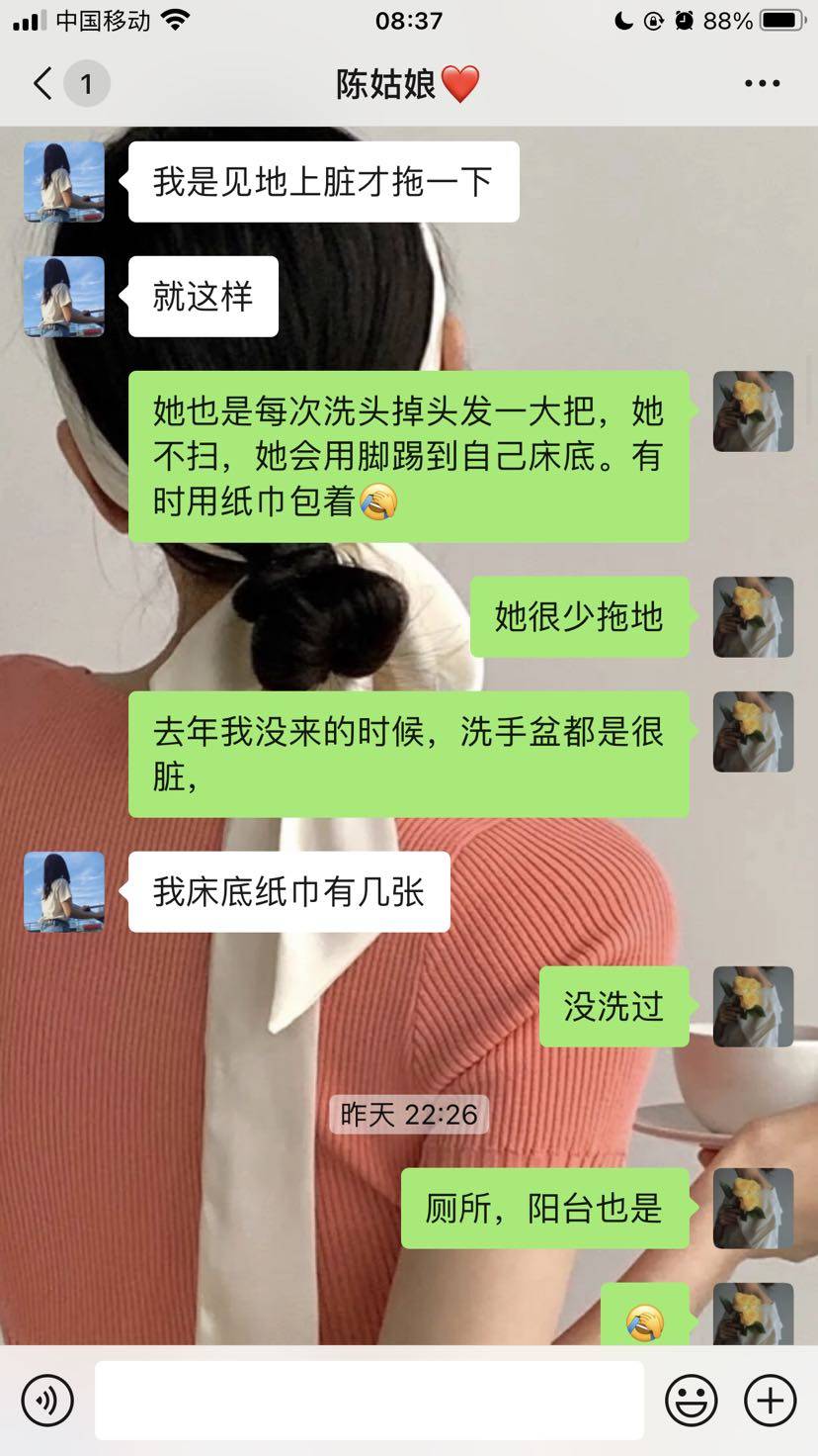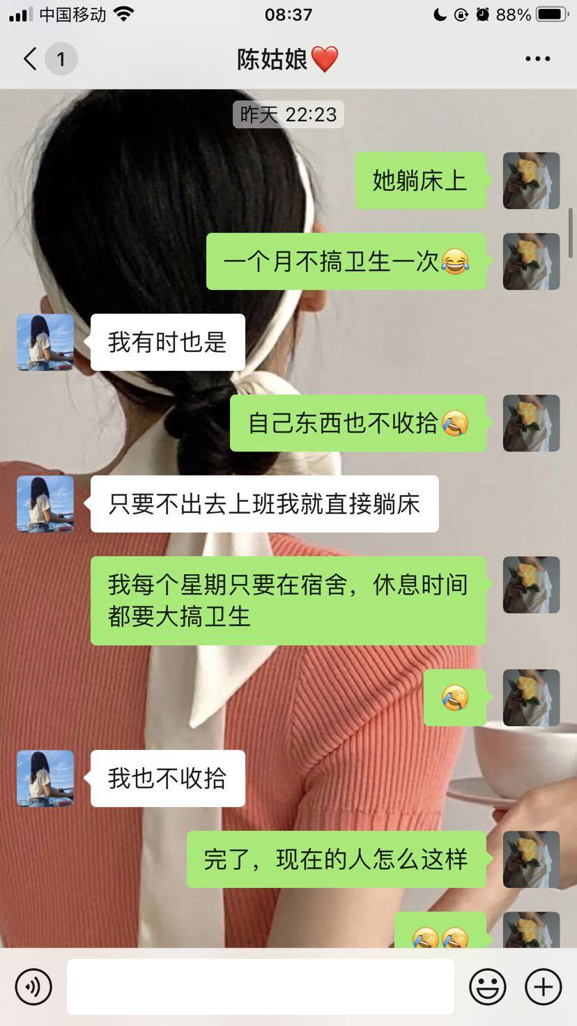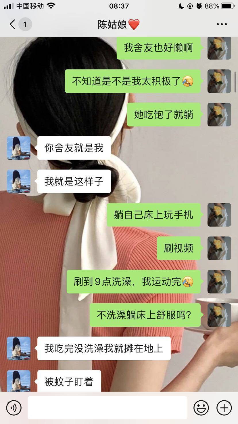 其实我跟我舍友相处得挺好的,平时有什么吃的,都会分享。她比我大三年,我今年本命年。她也是单身,不知道为什么她也不选择结婚,27岁了,她性格也是挺好的一个人,也像是个长不大的小孩,我们同一部门的,我会跟我闺蜜说这些话,可能我羡慕这样吧,吃饱了就躺着玩手机,感觉无忧无虑,而且她还不胖。😂😂如果是我的话,又会长肉,脑袋又会胡思乱想,不能让自己闲下来,要让自己忙起来。所以每天晚上我会坚持运动,从4月到现在已经坚持了两个月了吧。每天都是挺忙碌的,还是挺羡慕我舍友的。哈哈。