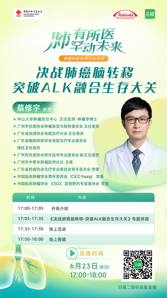本次直播我们有幸邀请到中山大学肿瘤防治中心的主任医师——蔡修宇教授,6月23日下午17点,跟着蔡修宇教授,一起“决战肺癌脑转移——突破ALK融合生存大关”,让我们一起期待!(识别二维码预约直播~)
