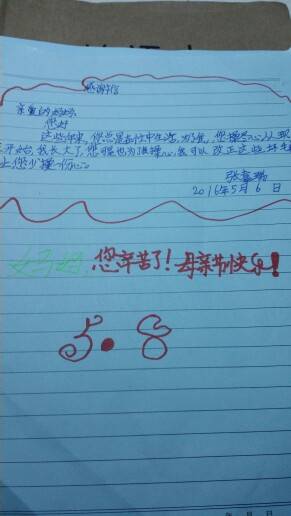 9岁的儿子,大清早的就给我惊喜,虽然语句不怎么通顺,瞬间觉得娃长大懂事,想想平时一个人那么辛苦的付出,现在觉得什么都值得了!祝天下所有的母亲身体健康,节日快乐