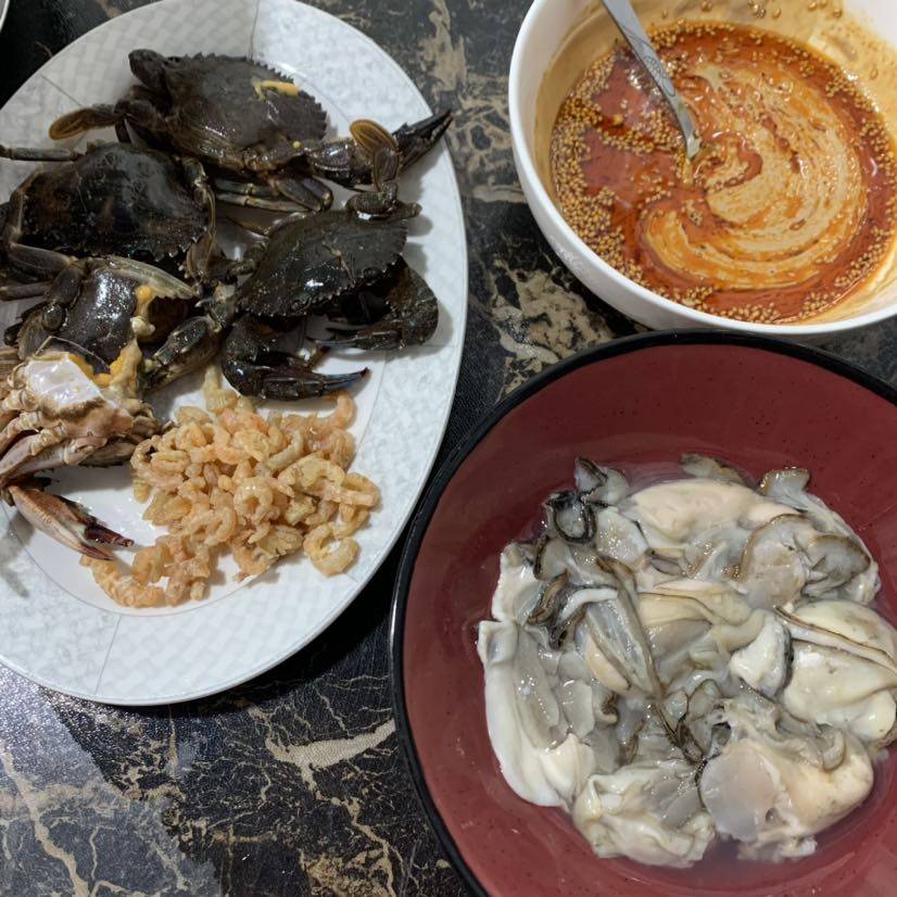 两男一女,四盘肉,又是虾还有蟹,分量很足