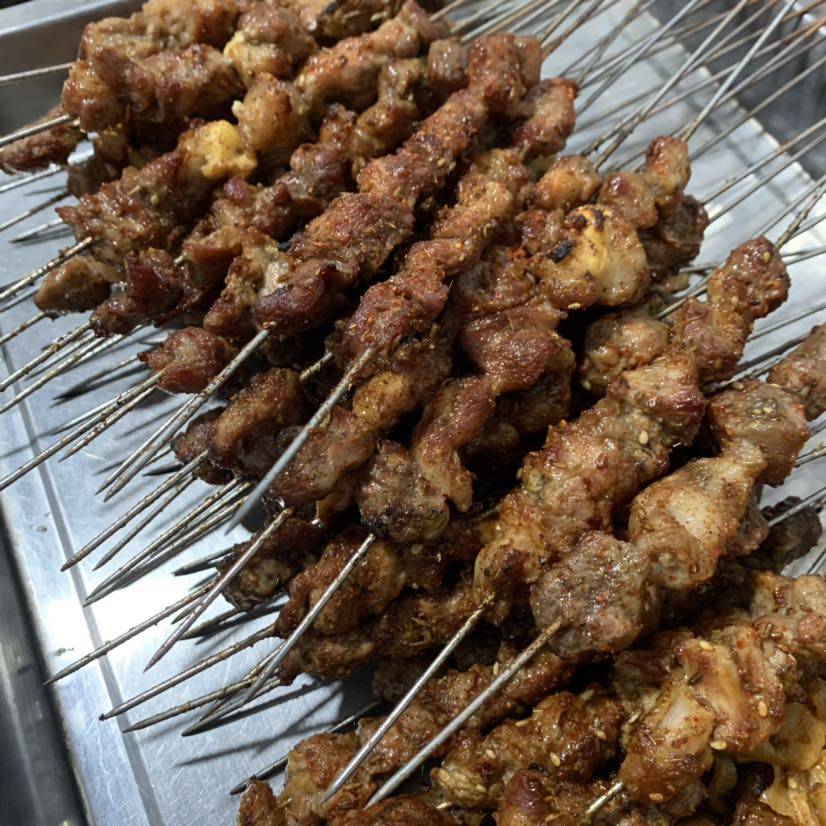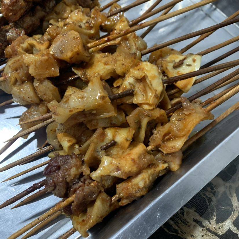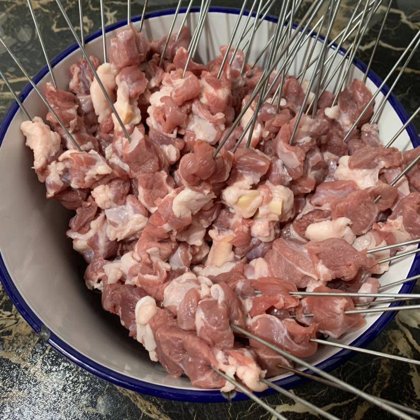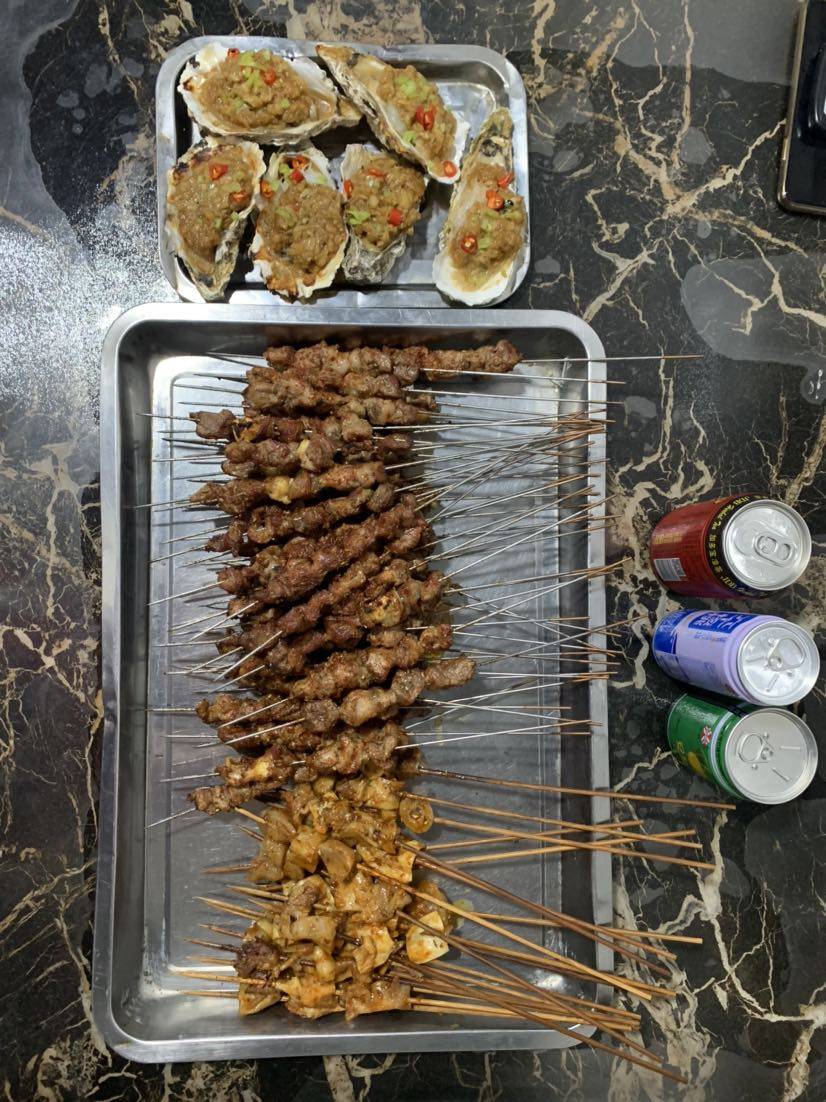穿好串以后,拿到老王哥们家烤串店加工后拿回小厨房吃