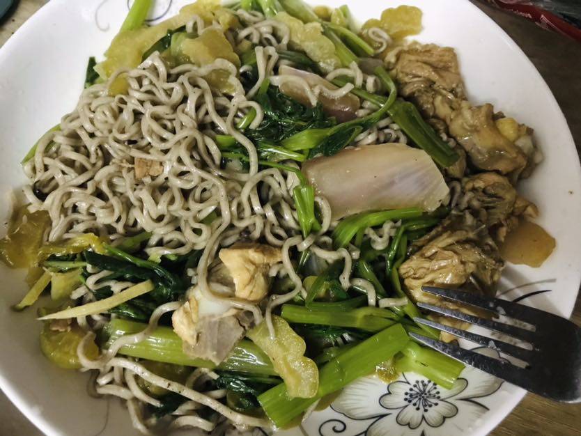 昨天中午自己煮的面,饭堂的菜。我们饭堂真的很少肉🥩。