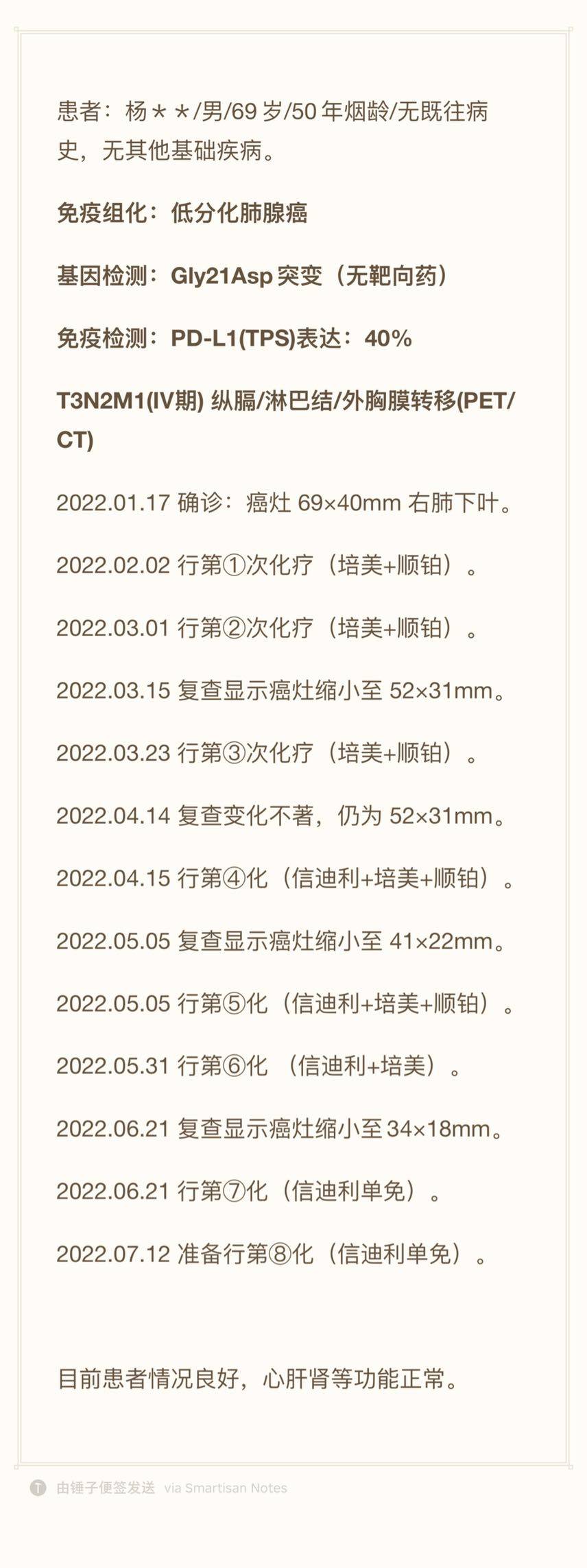 【治疗过程】化疗(培美+顺铂)、免疫药(信迪利)