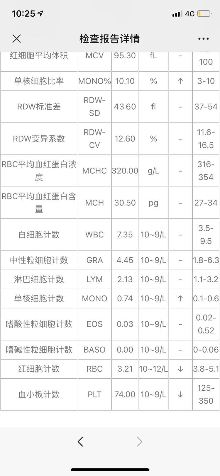 7月4号的血常规血小板降到了74,医生建议我7月5号再做一次,5号测的血小板是114,我很欣慰。