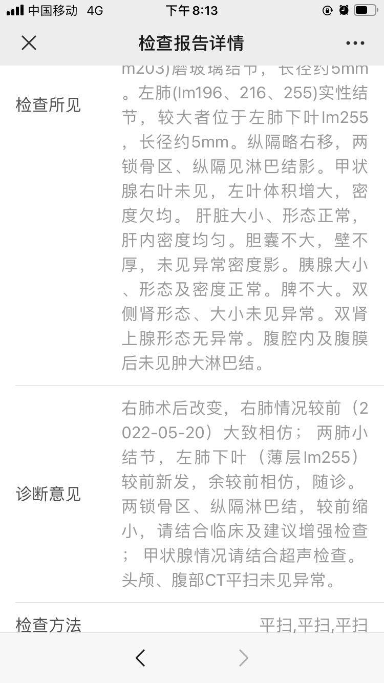 治疗前做了血检和CT。如我所愿,CEA再次下降到了手术后的历史最低值,12.59。CT也显示淋巴结较前缩小。但是有一项感觉不可思议,左肺竟然新发一小结节,直接懵逼了!这是咋回事呢?别人都是治疗的时候把小结节给消了,我反而长出来?!表示自己是怪胎一枚!