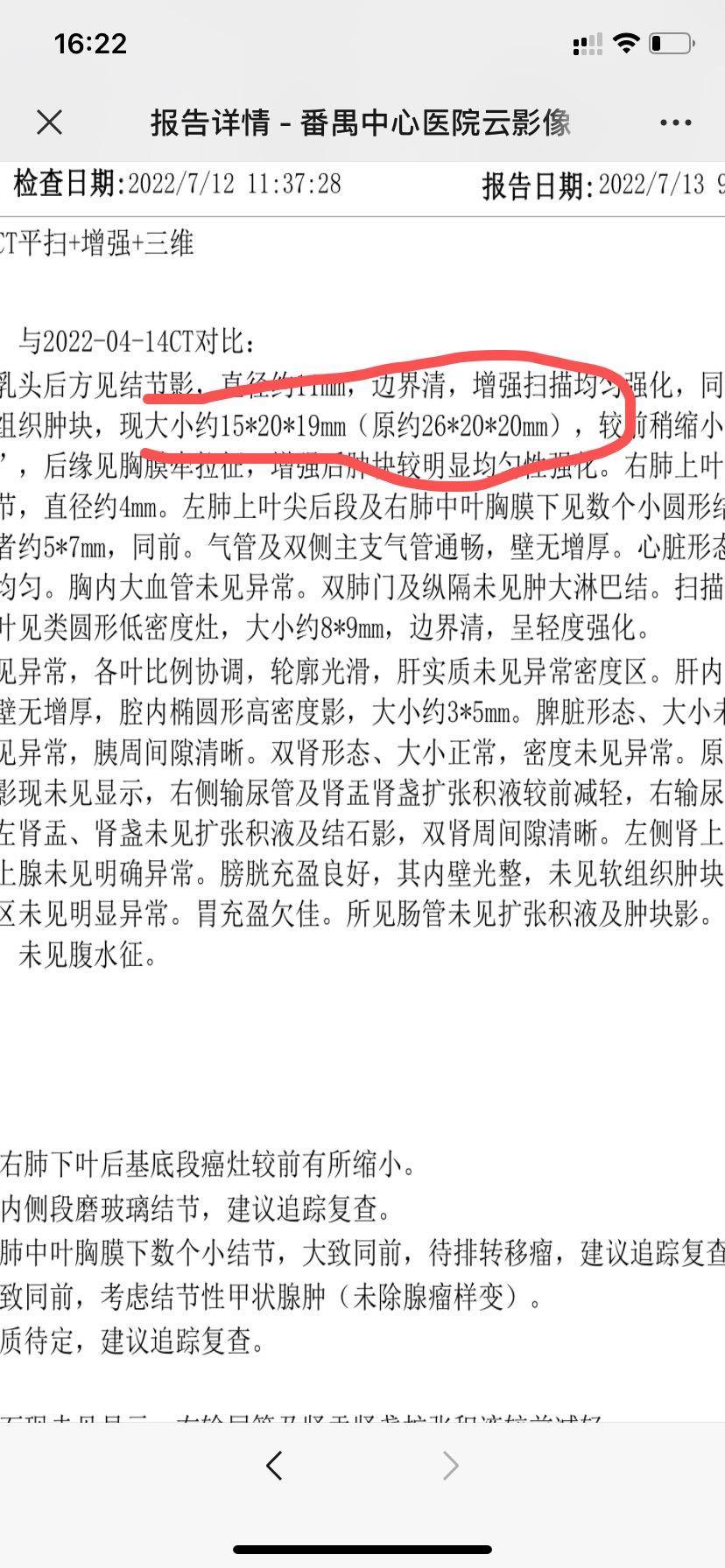 开始当地医生叫手术,做个pet ct看有否转移,因为考虑很多因素妈妈也有糖尿病,所以选择了保守治疗,没有做pet ct只做了个穿刺活检确诊后去做了基因检测是egfr19突变,吃着埃克替尼,现在缩小了,这次回去检查医生说根据几个月观察吃了靶向药结节都没有变化属于偏早期肺腺癌可以做个微创手术,毕竟靶向药不能根治只能抑制。然后听了医生说想着也行,因为不敢在当地医院做就在广州中肿挂了杨浩贤,他看了我妈片子说不用手术,继续吃靶向药,立马慌了,耐药的话怎么办呢?我和他说当地医生说最多10个月耐药,他说不一定的,有些人吃好几年,搞得我有点郁闷不知道下一步是不是就听他意见直接靶向治疗。