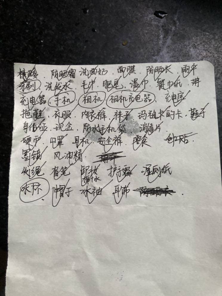 这是女儿的一个习惯,每次要出门前几天就开始想到什么就写下来,昨天晚上才开始收拾行李,照着单子上拿好的就划掉,既快又不会有遗漏。