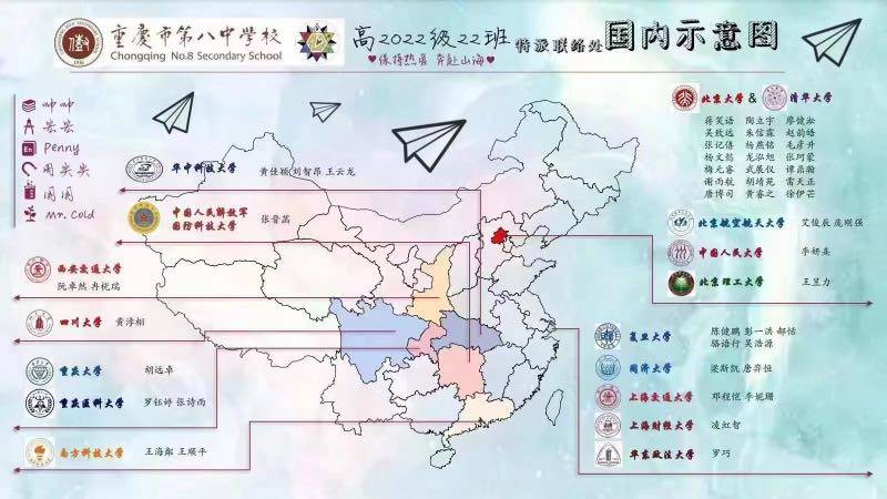 这两天群里在发蹭饭地图,昨天看到重庆一中的地图一个班考上13个清北,觉得非常牛了,发给儿子看,他不屑一顾说怎么能和重庆八中比。今天看到八中的地图,确实更牛,一个班21个同学考上清北,接近一半了,羡慕不来呀。