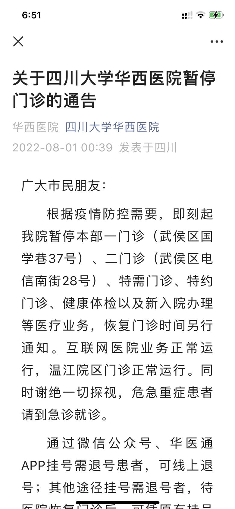 一早就看到华西医院因疫情停诊的消息,又有多少病人受影响啊。想起我手术前的一年半时间里可没少跑华西,每三个月就去复查一次。次次到华西医院都是人山人海的,根本没有淡季旺季之分。停诊一天损失得多大呀,管中窥豹,可见一斑,疫情对整个经济的影响。祈祷这一切早点结束吧!