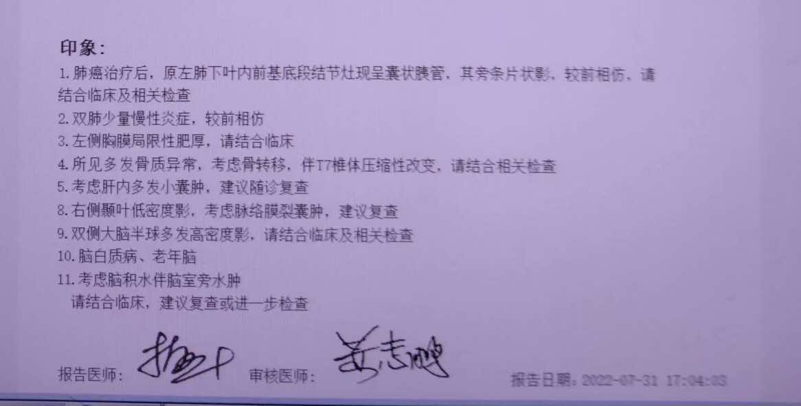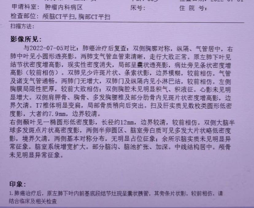 妈妈患肺癌已经有三年了,这三年来一直在接受治疗到现在,下面是妈妈检查以及治疗的过程。2010年10月,妈妈体检出肺癌IV期,纵隔淋巴转移,肝部转移,去省肿瘤医院复查,做了PET-CT,结果一样,省肿瘤