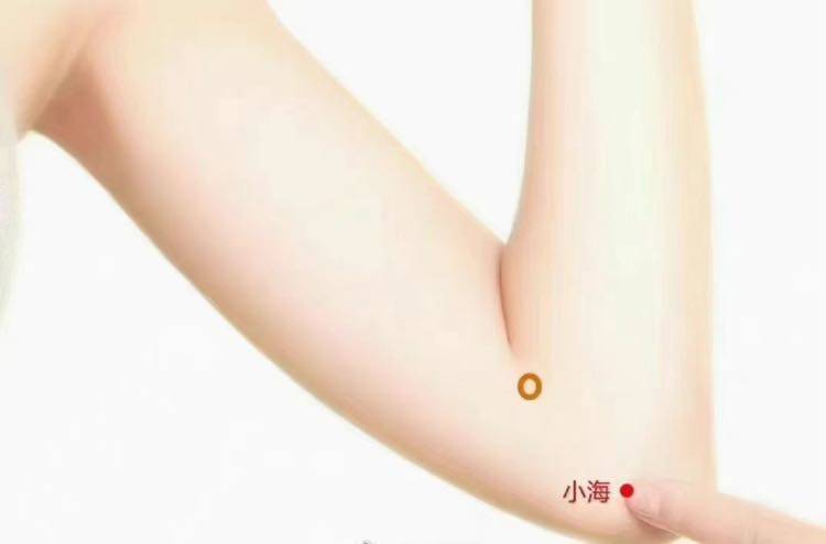 先看下小海穴定位,橘色圆圈位置是少海穴,少海穴和肘尖的中点大约就是小海穴,位于凹陷处,按摩起来很酸爽,出现上述问题,勤揉两臂这个穴位