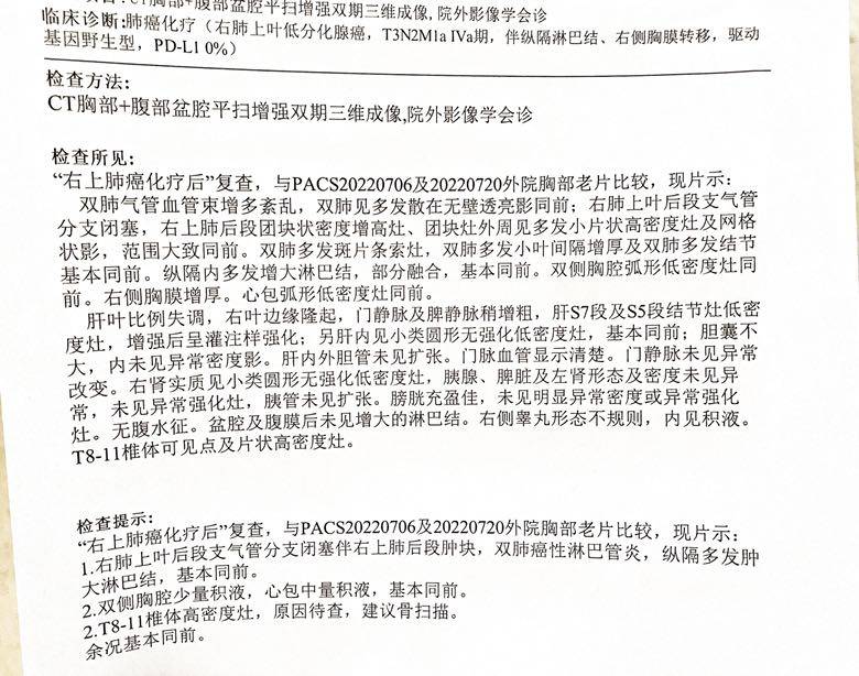 以下附他最新CT结果,心包积液和胸水都达不到抽取标准所以只能保守治疗。骨扫描6月底做过是正常的,加上7月感染来回三次CT,考虑辐射,医生未再进行安排。