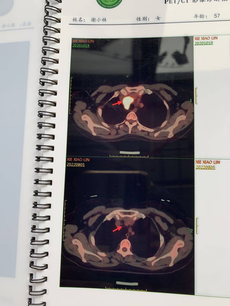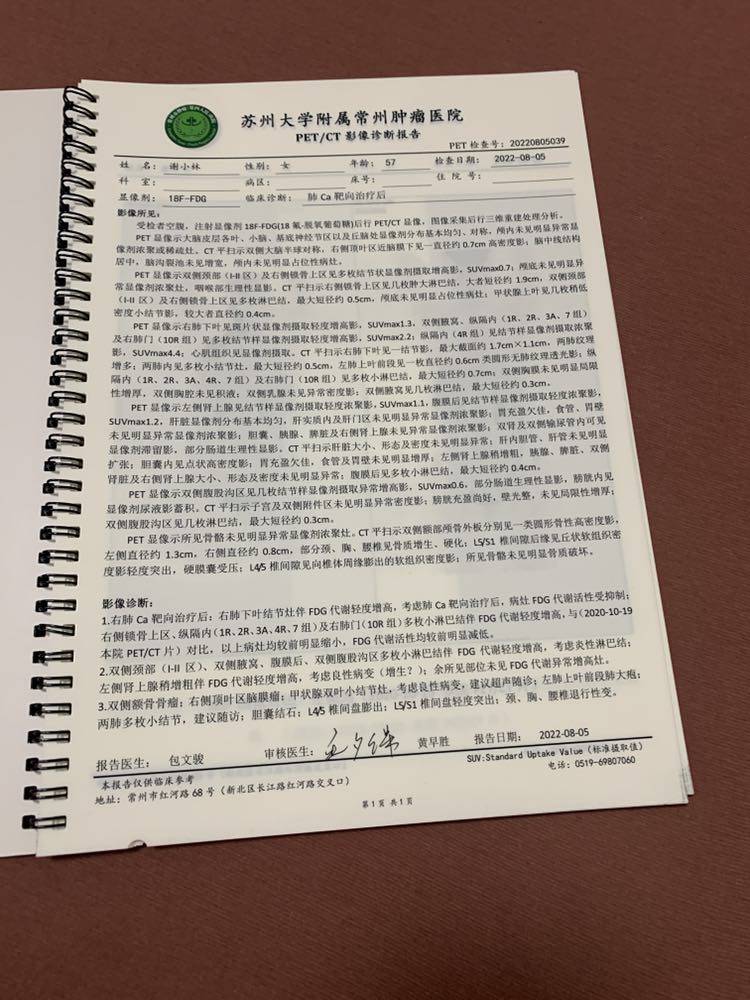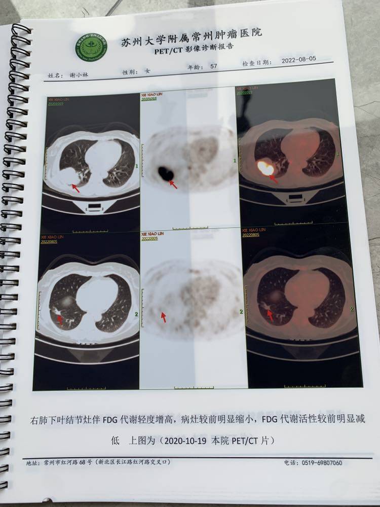 近几天有些忙,我是6月份去医院做的检查,各项指标都还可以。只有转氨酶高86.我的主治医生让我8月份再去医院做PEFCF。准备下次的治疗方案。8月5日上午来医院做了PEFCF,三天之后,报告出来了,跟2020年10月18日的片子比较,原来6公分✖️4公分的病灶现在只有1.7公分✖️1.1公分。左肺小结节也明显缩小,右后背淋巴结原来最大4公分的也明显缩小。总体来说,比原来想象的要乐观!