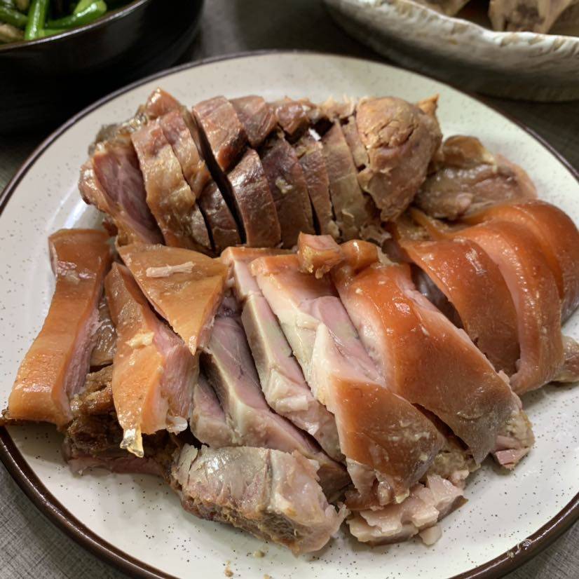 我中午吃了毛豆青椒烩大虾,清蒸螃蟹,蒜泥苋菜,肴肉冷切。