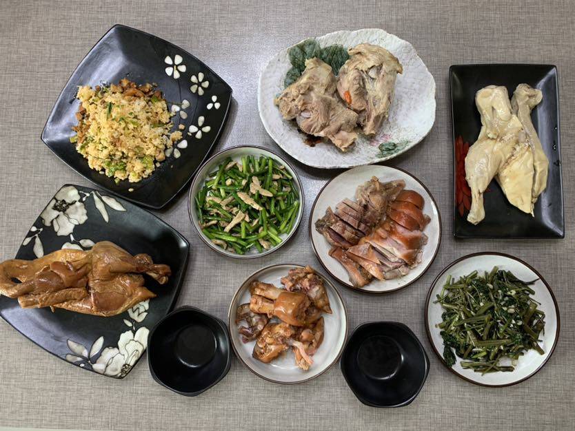老王对付我的中秋午餐😄他自己就做了四道菜😄剩下的都是单位分的熟食😄