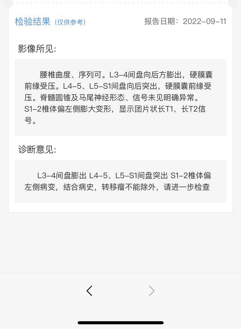 老妈从2020年11月做体检先是发现有脑转移瘤,进一步检查发现原发灶在肺部,12月份头部伽玛刀处理,2021年1月份肺部楔形手术,后续单药奥希替尼至今,今年6月份复查脑部肿瘤还算稳定,9月11号肺部CT也挺好,7月底摔了一跤盆骨疼痛,大夫让拍了片子后无异样,但是病情不见好,11号重新拍了脊椎核磁,发现s1 s2 椎体病变不排除转移瘤……