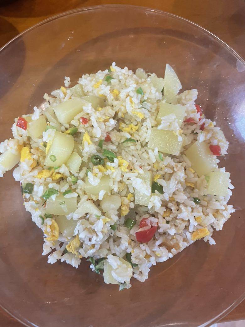 家里物资充足,今天中午吃土豆蛋炒饭,还加一盘藤藤菜,水果酸奶也没断。我们没加入封控前的抢米抢菜大军,还送出20斤米。那天知道要封了就买了十瓶酸奶,吃到今天最后两瓶了,买多了要过期。