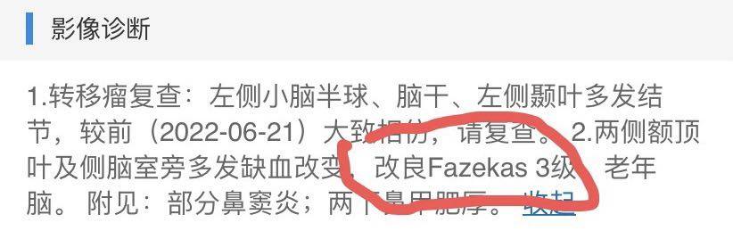 妈妈的情况就不再重复说了(想要了解两阳一阴只有淋巴结腋下和脑部多发转移,只进行过全脑放疗和立体定向,后来一直吃来曲唑,爱博新,打肚皮针两年来没有换过方案,再具体的情况就去看我之前的帖子吧),8.15-16两天的复查基本顺利通过,上个月因为工作的关系忘记发了,就是多出了一个fazekas3级,在之前每2-3个月的颅脑磁共振中从没有出现过,因为工作太忙,带高三,从8月20就开始几乎每天上课,没有周末,哪怕放假也是大打折扣,不确定什么时候放,就咨询了同医院神经内科主任花了60的在线问诊,想着同一家医院可以电脑上看到之前所有的影像,结果24小时过去,没回几条,更没看片子,真是坑,也是这家医院碰到过最不负责的医生,其他科室15块20块的在线问诊都是很详细解答,有需要时也会帮忙在空闲时看片子。后来拖了朋友,本地医院神经内科看过报告后认为问题不大,只要关注终究本身就行,而我之前因为网上各种查,觉得这个fazekas3级看着也挺严重的。近期又把爱博新最后一次的材料寄去北京审核也通过了,还剩10瓶中的最后两瓶慈善赠药没有领。8月份就两整年了,妈妈平安度过,希望有更多个两年,希望妈妈平平安安一直陪伴我们!给姐妹们报个平安,愿大家都好!
