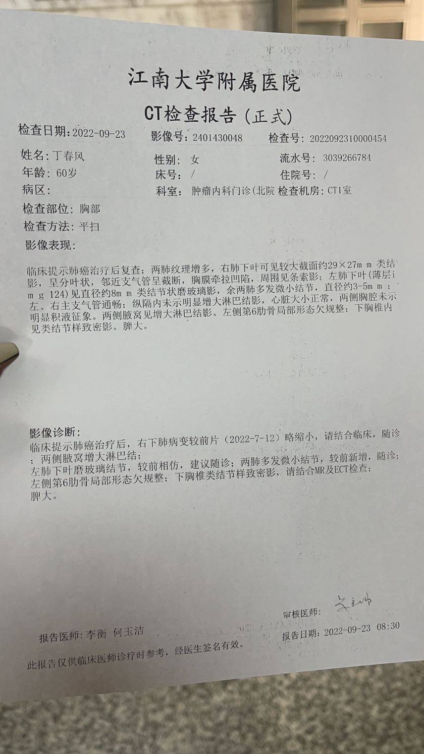 妈妈患肺癌已经有三年了,这三年来一直在接受治疗到现在,下面是妈妈检查以及治疗的过程。2010年10月,妈妈体检出肺癌IV期,纵隔淋巴转移,肝部转移,去省肿瘤医院复查,做了PET-CT,结果一样,省肿瘤