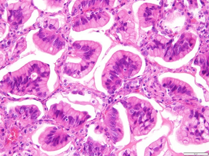 病理:黏液腺癌(IMA)由含有卵胞浆内粘蛋白(图 1),这在其他肺腺癌中很少观察到(1,2)。由于 IMA 中通常不显眼或不存在细胞学异型性,因此通过活检明确诊断恶性肿瘤通常具有挑战性。在经支气管活检中,准确的靶向可能有限,因为大多数 IMA 位于下叶的外围。此外,支气管组织的粘膜下粘液腺和IMA的肿瘤细胞由于看起来平淡无奇的细胞形态和胞浆内粘蛋白而可以相互模仿。经皮计算机断层扫描(CT)引导下的肺活检似乎是获得诊断组织的更有效方法,但是活检标本只能由无细胞粘蛋白池组成,因为肿瘤外围的肺泡间隙通常充满粘蛋白,这可能对应于胸部CT图像上的大叶肺炎样区域。即使肿瘤细胞包含在标本中,少量具有平淡形态的粘液细胞也不足以明确诊断恶性肿瘤。
