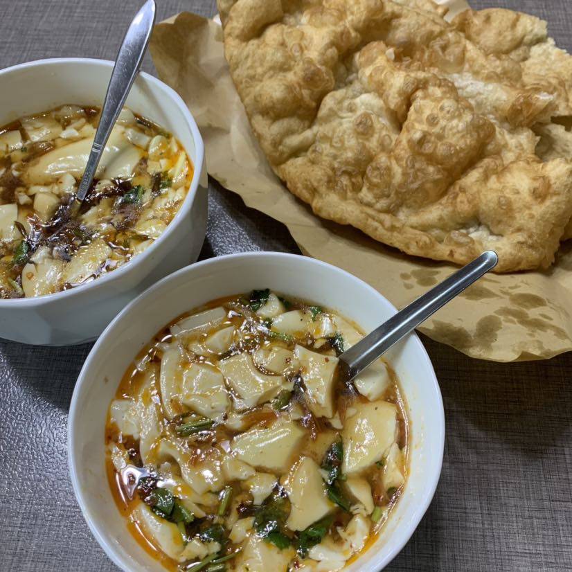 今天是我主刀医生的门诊,膝盖手术一个月的复查,早起老王出去买的豆腐脑和炸饼。