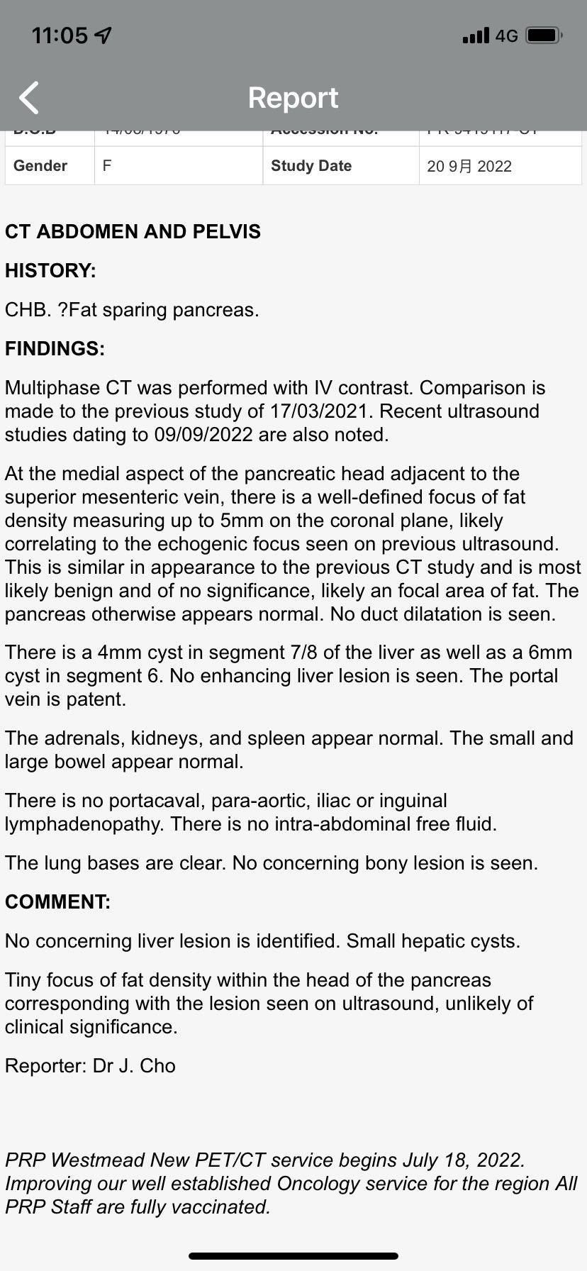 奥拉吃了一年,之前照了B超说有点疑似脂肪头,建议CT。上年三月手术前做了CT之后就没再做了,我心里一直觉得是否要做一下才放心,终于让我等到了。” 未发现有关肝脏病变。小的肝囊肿。